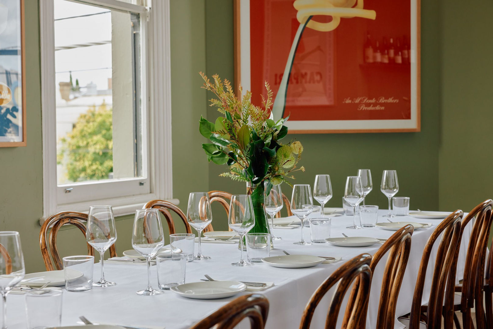 The Lombardy Room is warm and classic with sage green walls and eclectic Italian artwork. It can accommodate up to 32 seated guests in a number of different table configurations.